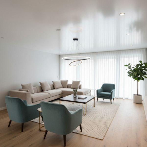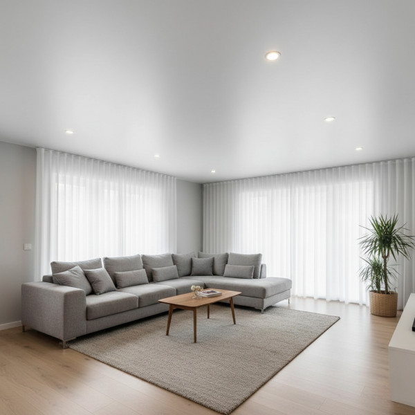 Главная особенность такого типа потолочной отделки на площади любого размера – полное отсутствие сварных швов на потолке. Это основное достоинство. Не обязательно устанавливать плиты гипсокартона, чтобы получить «тот самый» эффект матового потолка в белом цвете в интерьере. Для этого идеально подходят следующие материалы изготовления: