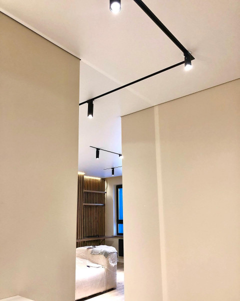 3.разделить комнату на зоны с помощью яркого акцента – потолочных треков на шинопроводе;