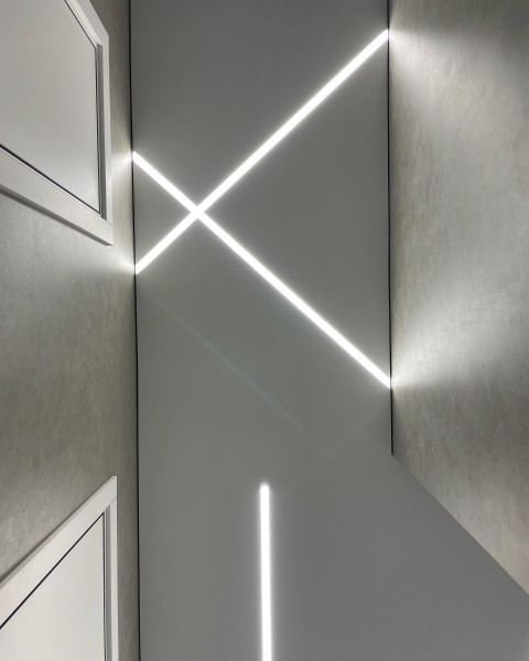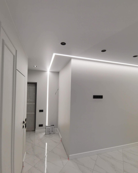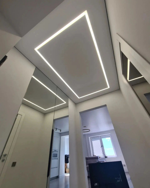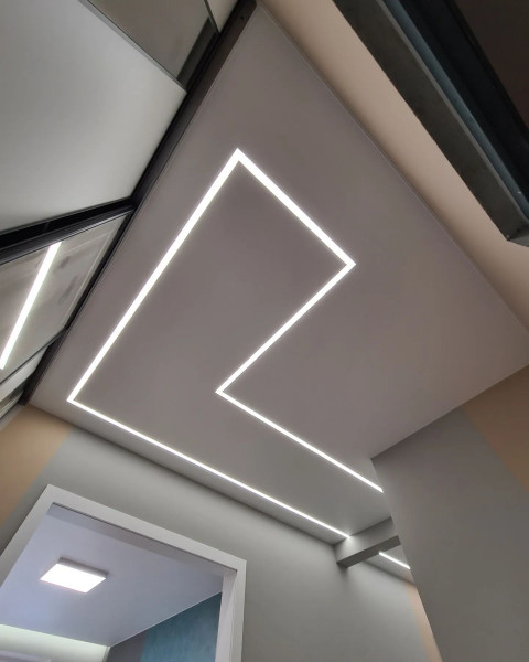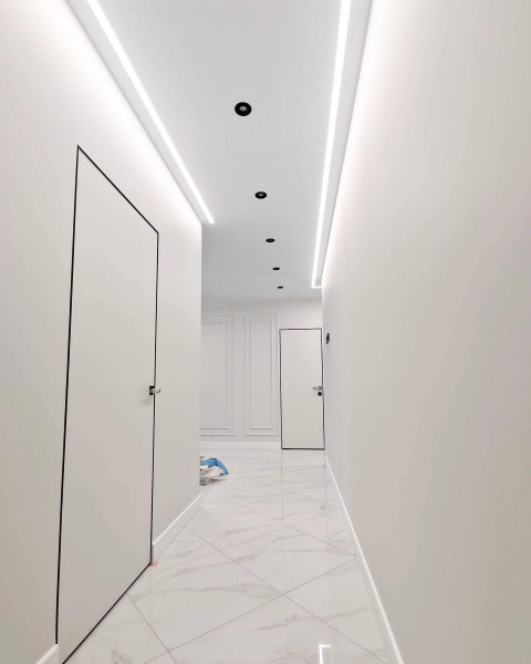 - Возможность встроить любую систему света от трековых светильников и спотов на шинопроводе до точечных, световых линий и парящих.