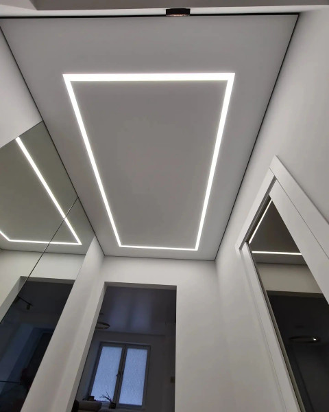 - Возможность скрыть коммуникации: системы видеонаблюдения, вентиляцию, датчики и системы. Все это скрывается под полотном, а доступ к узловым точкам можно сохранить через ревизионный люк.
