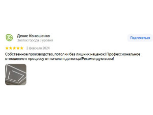 Добрый день, хочу сказать огромное спасибо за Ваш труд. Установили нам полотна Pongs, освещение от lumfer и криволинейные конструкции. Выбрали дизайнерскую люстру. В итоге мы с мужем стали обладателем уникального потолка! Монтажники сделали все оперативно, качественно и аккуратно, использовали безопасные газовые баллоны. Качество превзошло ожидания, несмотря на сложную дизайнерскую задумку. Буду всем рекомендовать Вашу фирму. Еще раз СПАСИБО!